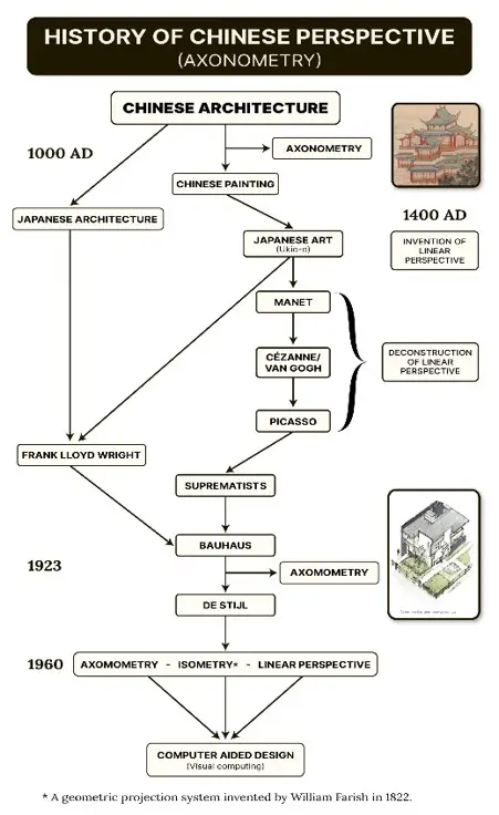 The Chinese system of axonometric projection—a method of depicting space without a vanishing point—spread to Japan, influencing Ukiyo-e art, which later inspired Manet, Cézanne, and Van Gogh to move away from optical pressentation through the deconstruction of linear perspective. By the 1960s, axonometry, isometry, and linear perspective merged in Computer-Aided Design and other digital visualization tools of visual computing, linking an ancient Chinese geometry to the foundations of modern design. From East to West: The Hidden TransmissionAxonometry reached Europe through Jesuit intermediaries in the eighteenth century, who brought Chinese drawings home as curiosities. European draftsmen adapted the technique for technical illustration, where its lack of optical distortion proved invaluable. In 1822, the British scientist William Farish codified the mathematical basis of axonometry in his invention of isometry — a projection system of “equal measures” that preserved true proportions without recourse to the vanishing point. Farish's innovation coincided with the Industrial Revolution's demand for precision. Machine parts, weapons, and architectural plans required measurable accuracy, not optical illusion. Yet the aesthetic implications of this “non-perspective” remained unrecognized until the early twentieth century, when the modernist avant-garde discovered it. The Modernist RediscoveryBy the 1910s, European art and architecture were undergoing a radical reorientation. The Japanese woodblock print (ukiyo-e), itself based on Chinese axonometric principles, had already transformed Western painting. Artists such as Manet, Cézanne, and Van Gogh eliminated chiaroscuro and undermined linear depth, seeking the immediacy of flat yet dynamic space. Cézanne began to tilt and overlap objects seen from different vantage points; Picasso pushed further, fusing multiple viewpoints within a single form — the birth of Cubism.