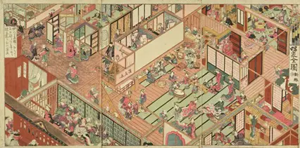 Above: Axonometry in Ukiyo-e composition. A Japanese multi-storey interior rendered in axonometry. The absence of a vanishing point allows simultaneous depiction of multiple rooms and actions, embodying narrative time within spatial continuity.