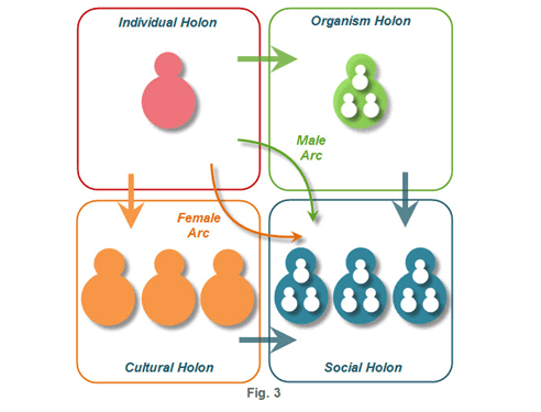 Meanwhile the geometry of the quadrants is not arbitrary. Whole/part relations link correlates and quadrants strictly in a certain manner. Arrows on the picture above show these directions. The lower round points at the direction towards the social holon through communion, the upper one follows the direction through behavior or agency. The lower arc could be identified as feminine, the upper arc - masculine, as it corresponds with the known accents in the development of men and women. So, it is "The two hands of God" - cognition through organism's sensation and cognition through understanding. Then the consciousness of the individual holon metabolizes the results of cognition into certain models.