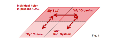 The individual holon possesses dimensions-perspectives I, we, it, and its. "The inner dimension" of my ORGANISM is MYSELF. "The external dimension" of MYSELF is my ORGANISM. I and ORGANISM happens to be in a rigid hitch. Culture and social systems only interact with my mind-body and condition them, they influence on one another.