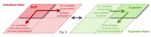 The holon of my organism ("Body" with the capital letter) will have as a correlate in UL-quadrant NOT MY SELF, but the sum total of all consciousnesses (autopoetic patterns) of sentient holons that constitute the organism including my SELF! Even consciousnesses of other organisms with symbiotic relations could be seen among them. They all constitute UL-correlate of the given organism. And it's very important for understanding the mind-body interrelation. There is no entire holon spreading out on both quadrants.