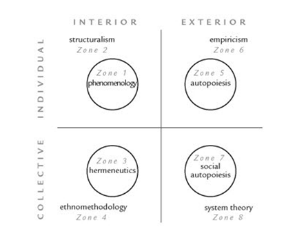 "To me personally, this is simply sad, because all if it can be salvaged with a few simple moves. But I've been watching this field for almost 30 years, and few of its authors nave yet gotten the point about intersubjectivity (which basically means, they have not included the Lower-Left quadrant; or more specifically zone #2 in the UL and zone #4 in the LL)." (IS, 178)