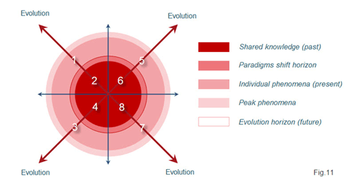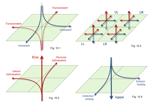 On the fig. 9 the holons in all 4 quadrants are pictured. The attractors in the direction of which holons could develop are pictured symbolically. Since autopoesis, as we assumed above, acts in all 4 quadrants, all 4 basic types of holons are subjected to trends of the future. There is a power that forces them to gravitate to a certain state or form. This power is an evolutionary inertness of quadrants. I think that people tend to project this power onto God image. And it is this power that is in sense realized as conscious.
